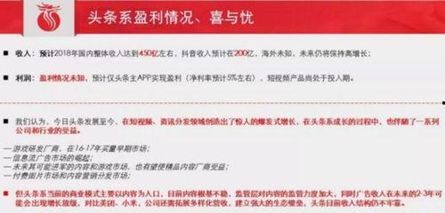 首先,让我们来认识一下今日头条。这个我们每天都会打开的APP,已经从一个小众的内容平台,成长为国内顶尖的互联网公司之一。2012年,今日头条由张一鸣创立,凭借其精准的内容推荐算法,迅速吸引了大量用户。如今,它不仅拥有庞大的用户群体,还成功登陆了资本市场。