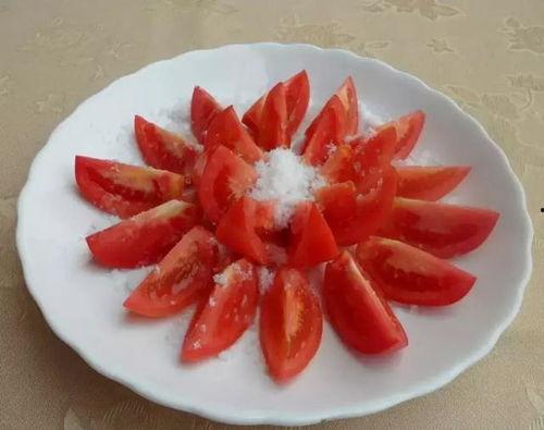 3. 调味:在切好的西红柿片上撒上适量的盐,让西红柿片稍微腌这样既可以去除西红柿的涩味,又能让味道更加鲜美。